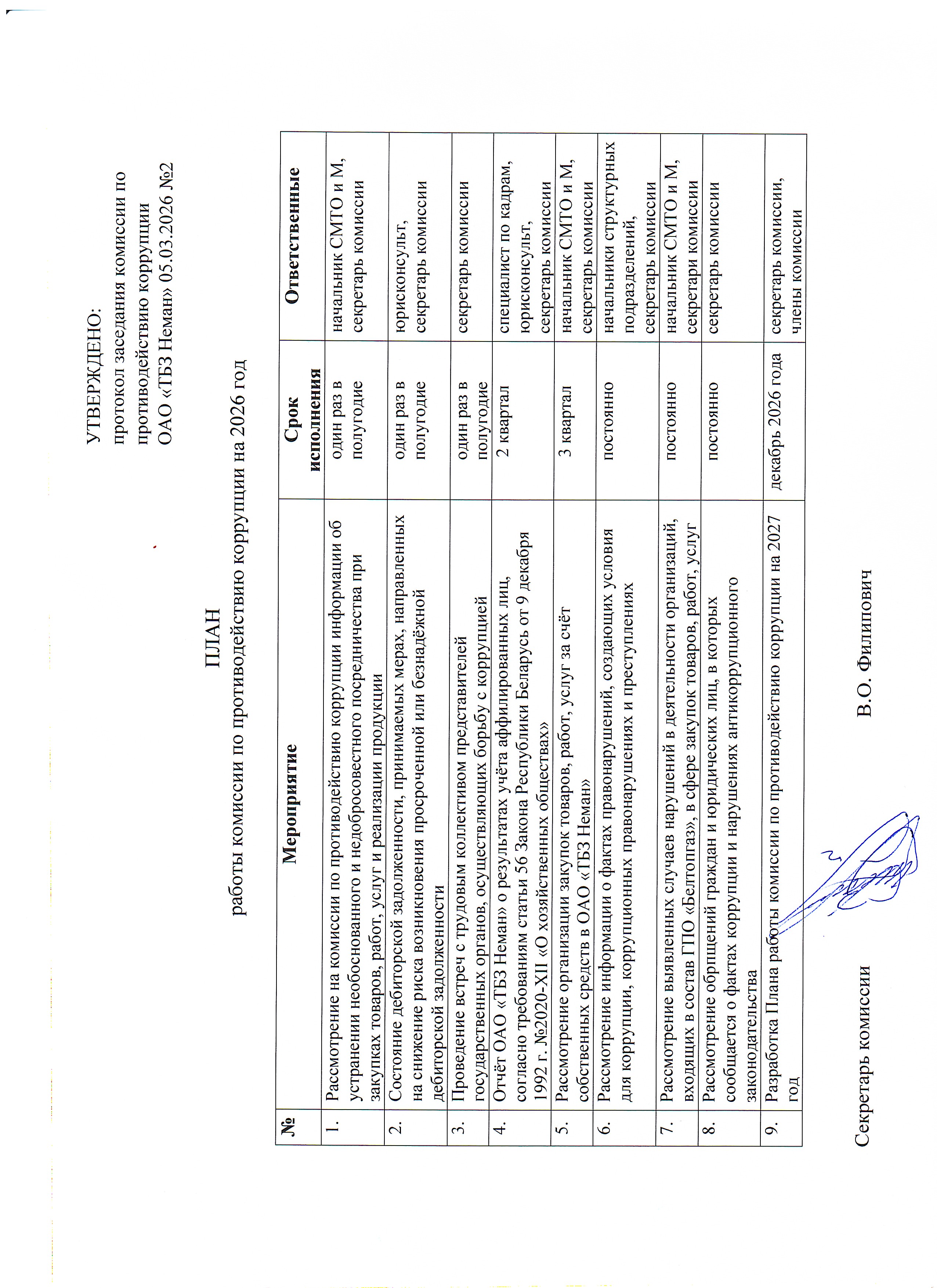 Состав комиссии по противодействию коррупции ОАО «ТБЗ Неман» Положение комиссии по противодействию коррупции ОАО ТБЗ Неман.docx План работы комиссии по противодействию коррупции на 2026 год